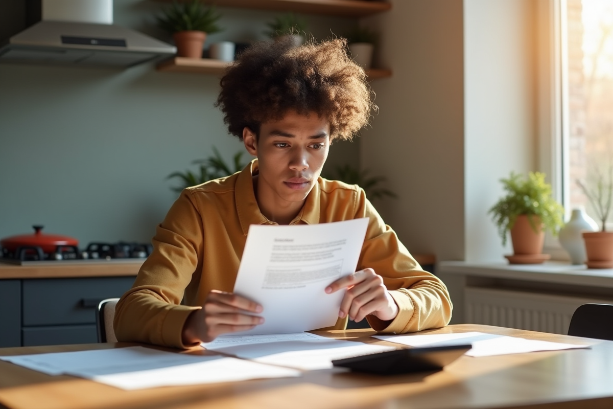 Jeune locataire inquiet tenant un avis de loyer impayé dans une cuisine lumineuse